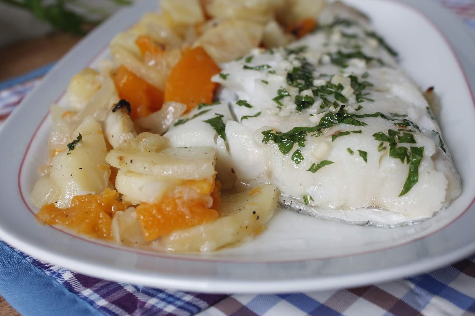 Bacalao skrei al horno con patatas y calabaza Con sabor a huerto