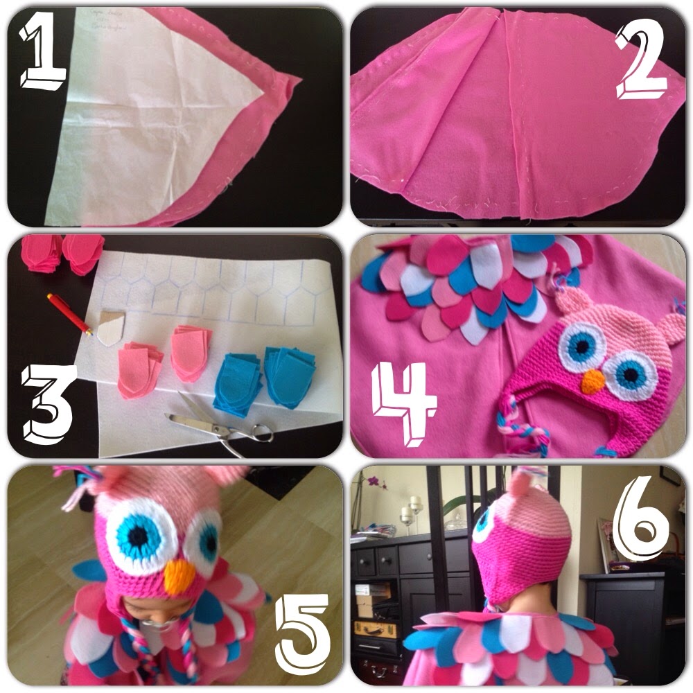 Este disfraz de búho consta de una capa con capucha donde va la cabeza de búho. Se pensó así porque los niños pequeños no aguantan mucho rato un sombrero, o algo en la cabeza, como una cabeza de búho. Para que el disfraz se siguiera viendo disfraz, se optó por poner la cabeza del búho como capucha de la capa. Aquí lo explican.
