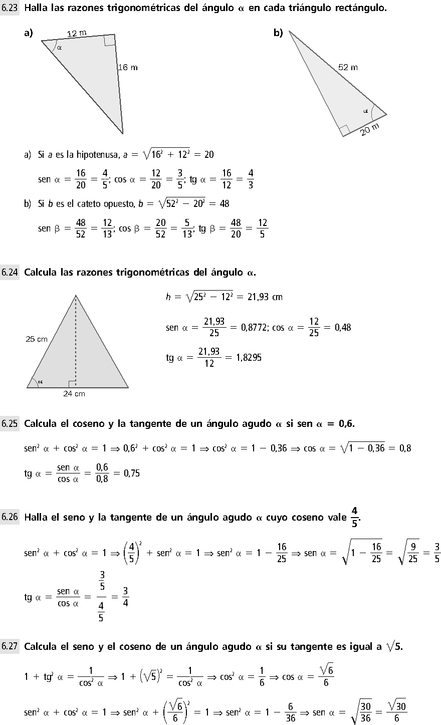 7 Soluciones a los ejercicios y problemas 5 Calcula las razones trigonométricas de los ángulos A^ y C^, ABD ì y CBD ì. = = 9; = = 20 Relaciones fundamentales 6 Si sen a = 0,28, calcula cos a y tg a utilizando las relaciones funda- mentales (a < 90°).cos a = = 0,96; tg a = ≈ 0,292 7 Halla el valor exacto (con radicales) de sen a y tg a sabiendo que.