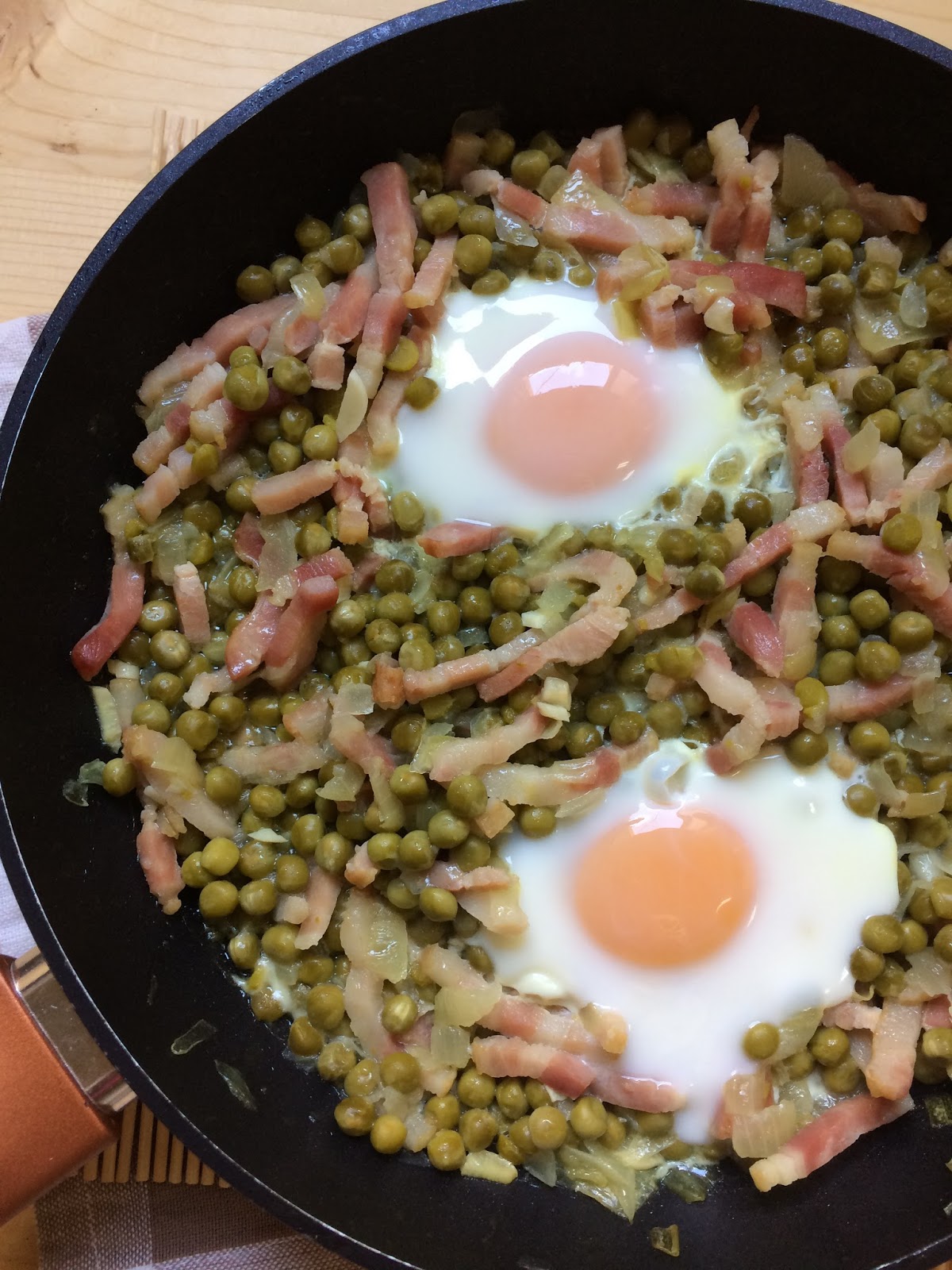 Guisantes con bacon y huevos