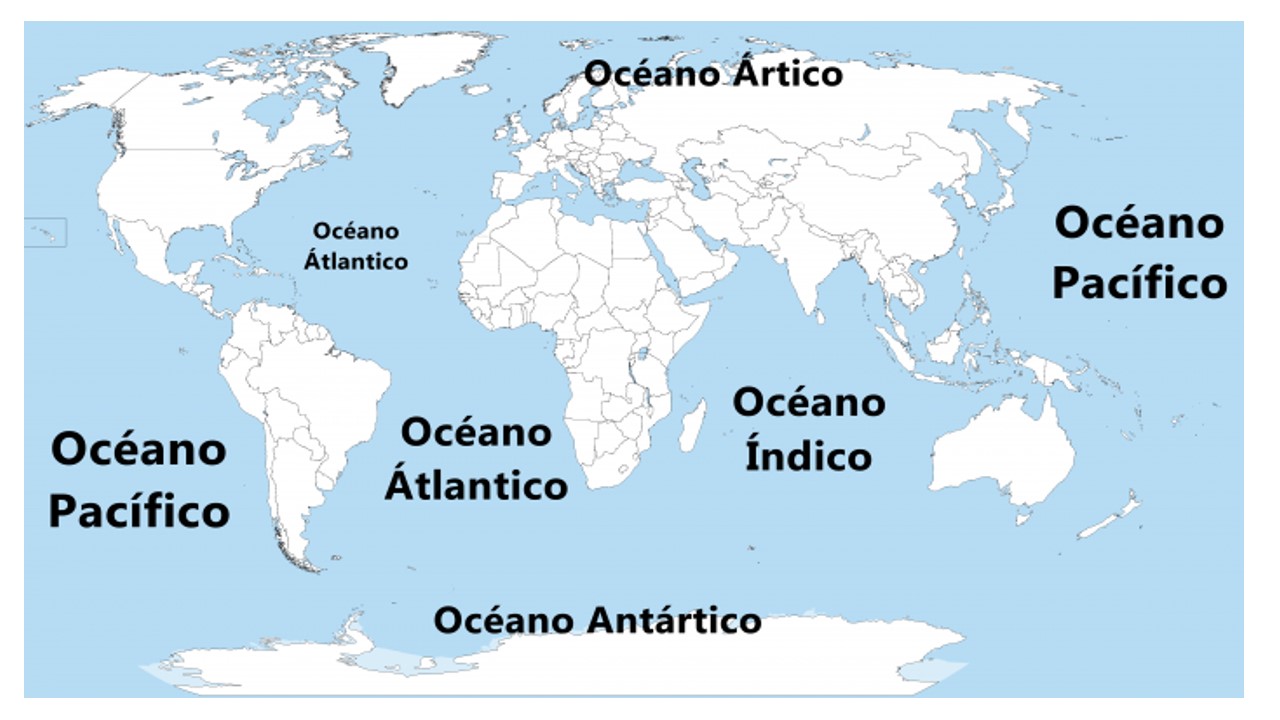 Generalmente se reconocen 5 divisiones oceánicas: Pacífico, Atlántico, Índico, Ártico y Austral / Antártico. Las dos últimas mencionadas a veces se consolidan en las tres primeras. Los límites de los océanos delimitan las aguas oceánicas de la Tierra. La definición y el número de océanos pueden variar según los criterios adoptados.