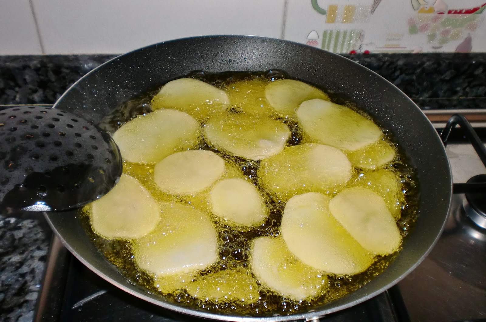 Instrucciones. Se cortan las patatas a rodajas y se fríen a fuego lento en una sartén con abundante aceite. Preparamos mientras el ajo cabañil: Echar en un mortero unos 5 o 6 dientes de ajo y los machacamos, cuando estén machacados añadimos al mortero un buen chorro de vinagre y removemos bien.