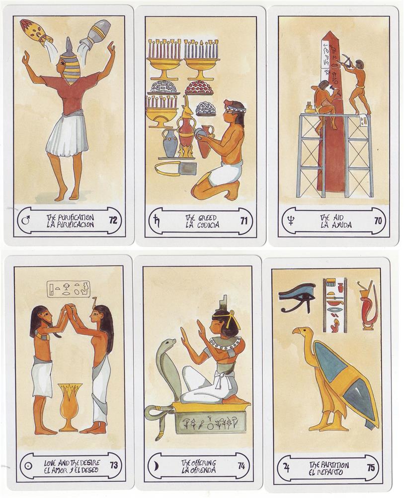 Las cartas del Tarot Egipcio gratis consta de las clásicas 78 cartas tradicionales, pero estas no tienen los palos tradicionales (Oros, bastos, espadas, copas), sino son una secuencia numérica con imágenes de situaciones comunes de la vida de cada persona en en tres planos.
